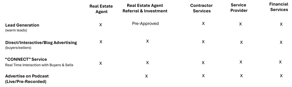 Real estate professionals are provided with warm/pre-approved buyer and seller leads, plus the opportunity to generate additional revenue by showcasing their products and services through live, interactive networking platforms.